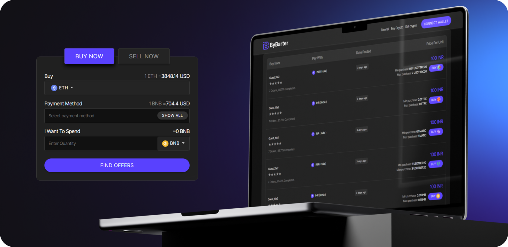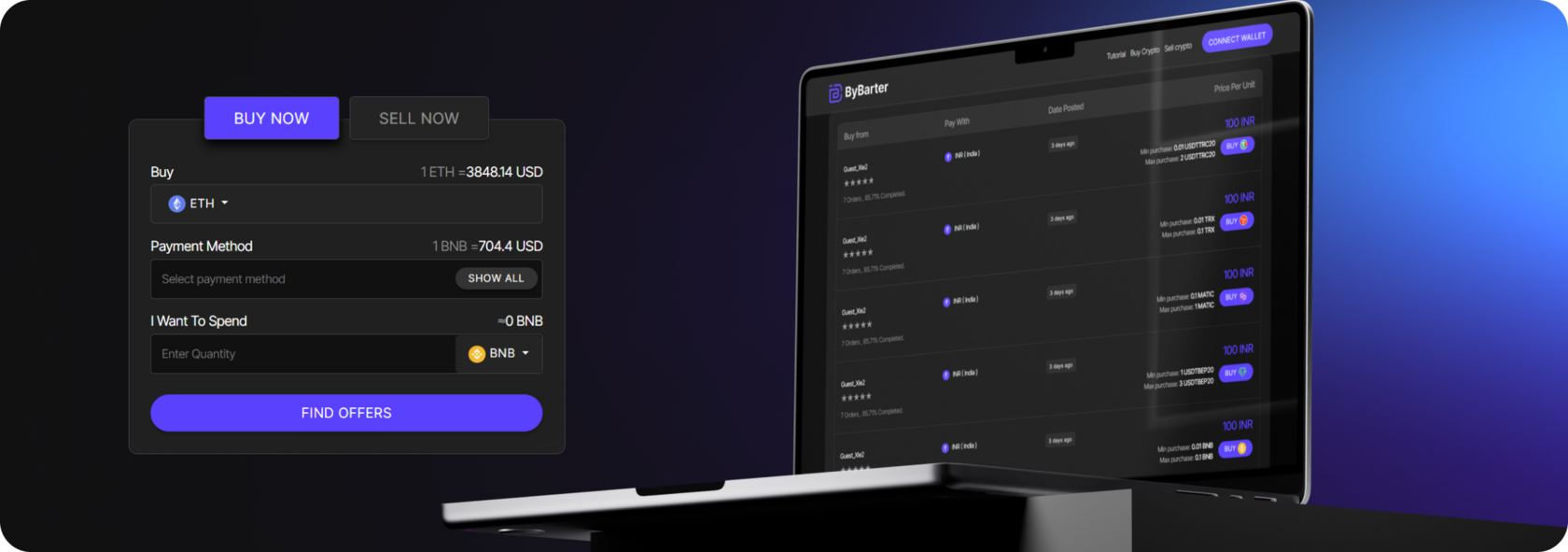 Buy Crypto directly into your Metamask, Trustwallet and all major hot and cold wallets from the Bybarter platform. Exchange your fiat to crypto directly with other users online.